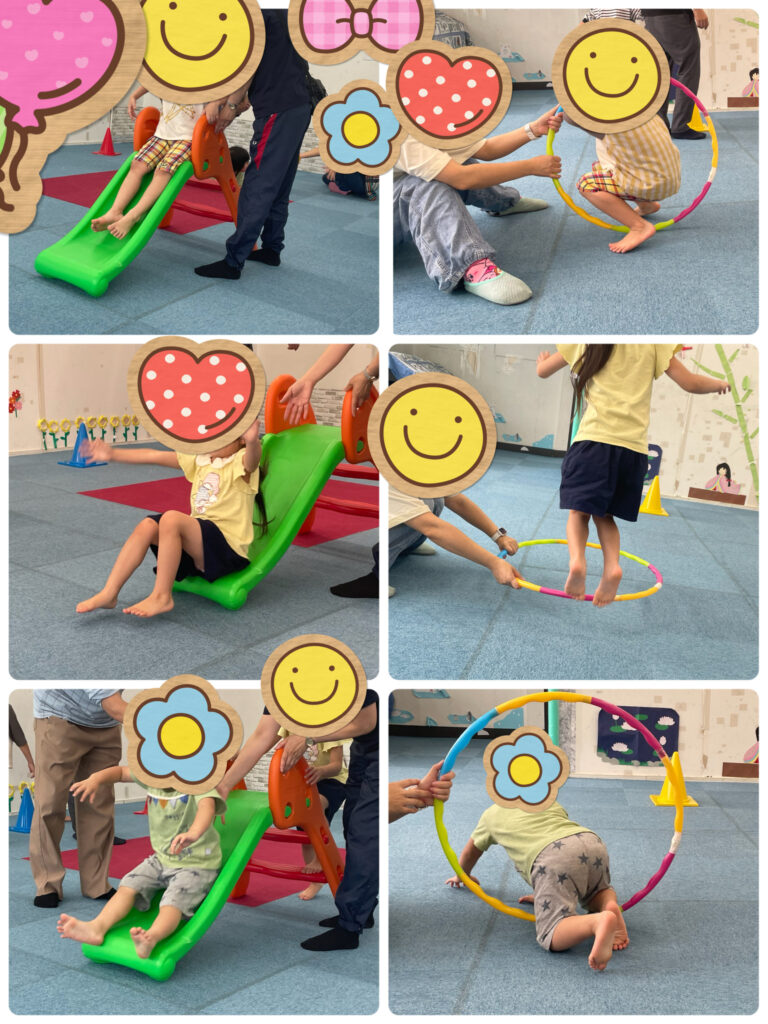 音楽もリズムに乗りながらフラフープをくぐり抜けたり跨いだりしたりミニすべり台をすべってたくさん体を動かしました(*’▽’)