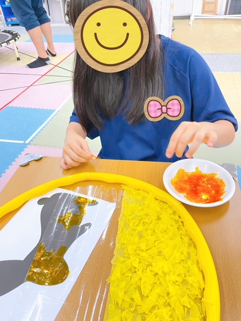 月の部分はお花紙で取り組んでいますが、うさぎの部分は黄色のセロハンを貼り付けています☆