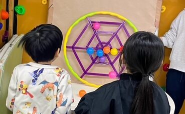 テープで出来たくもの巣にボールを投げて、どちらのチームが多くくっつけることができるか競い合いましたよ(^^♪