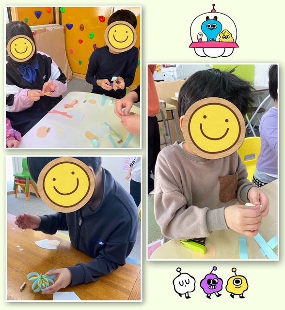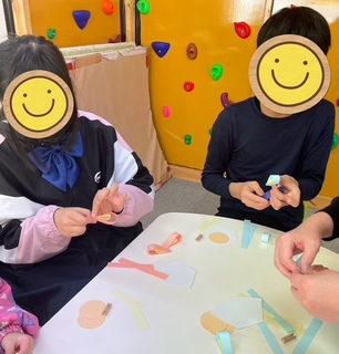 ホッチキスも両面テープも使い慣れていないこともあり組み立てるのが難しい様子でした(*_*)