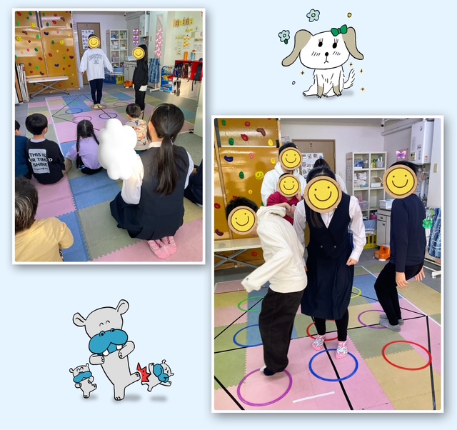 【輪っかジャンプ】や【9マスおにごっこ】等みんなで合わせたり、